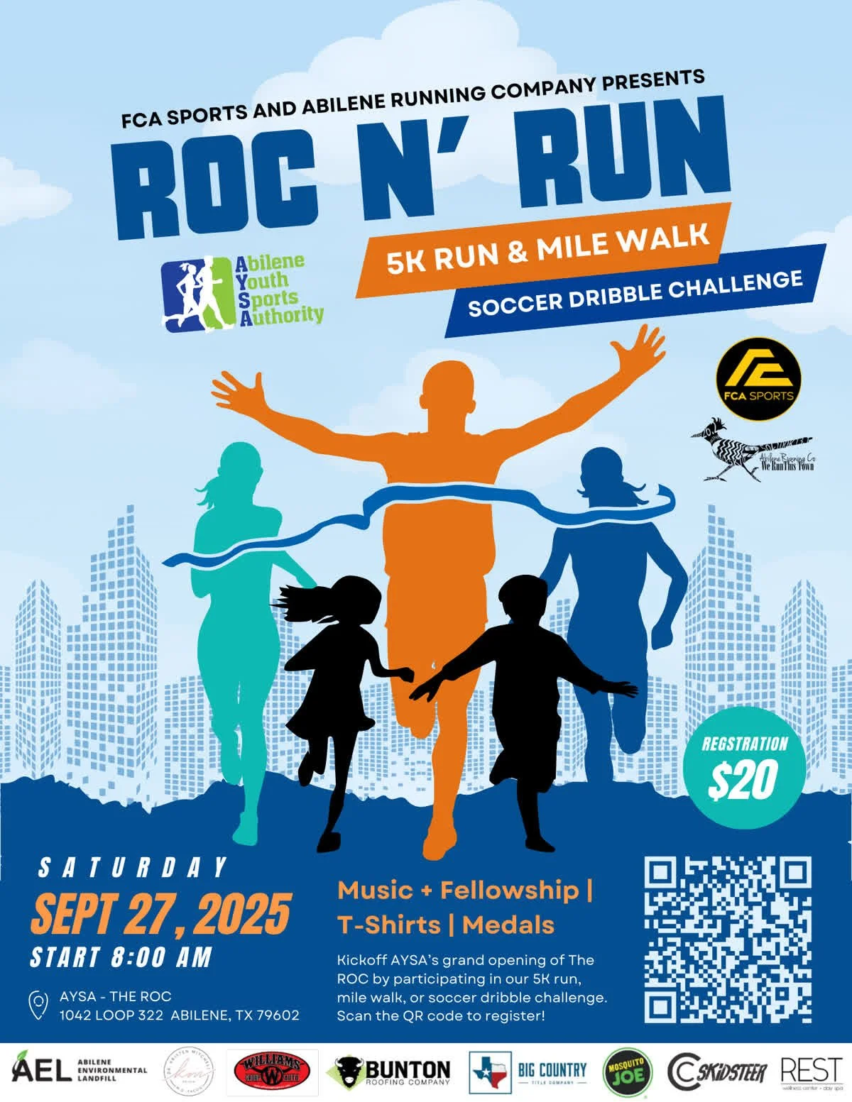 Join Bunton Roofing in celebrating the ROC Grand Opening with Abilene Youth Sports Authority’s first ROC N RUN 5K & Mile Walk on Sept. 27, 2025.