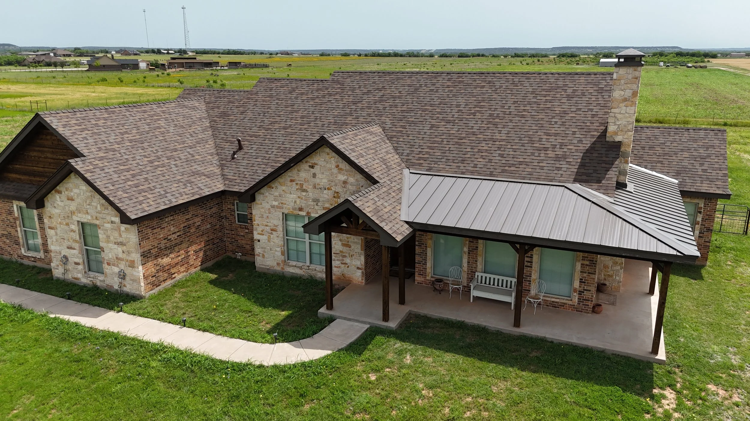 Bunton Roofing replaced the roof on an older rock home in Tuscola, TX using CertainTeed Landmark ClimateFlex IR AR shingles, new attic ventilation, and updated vents after an insurance claim.