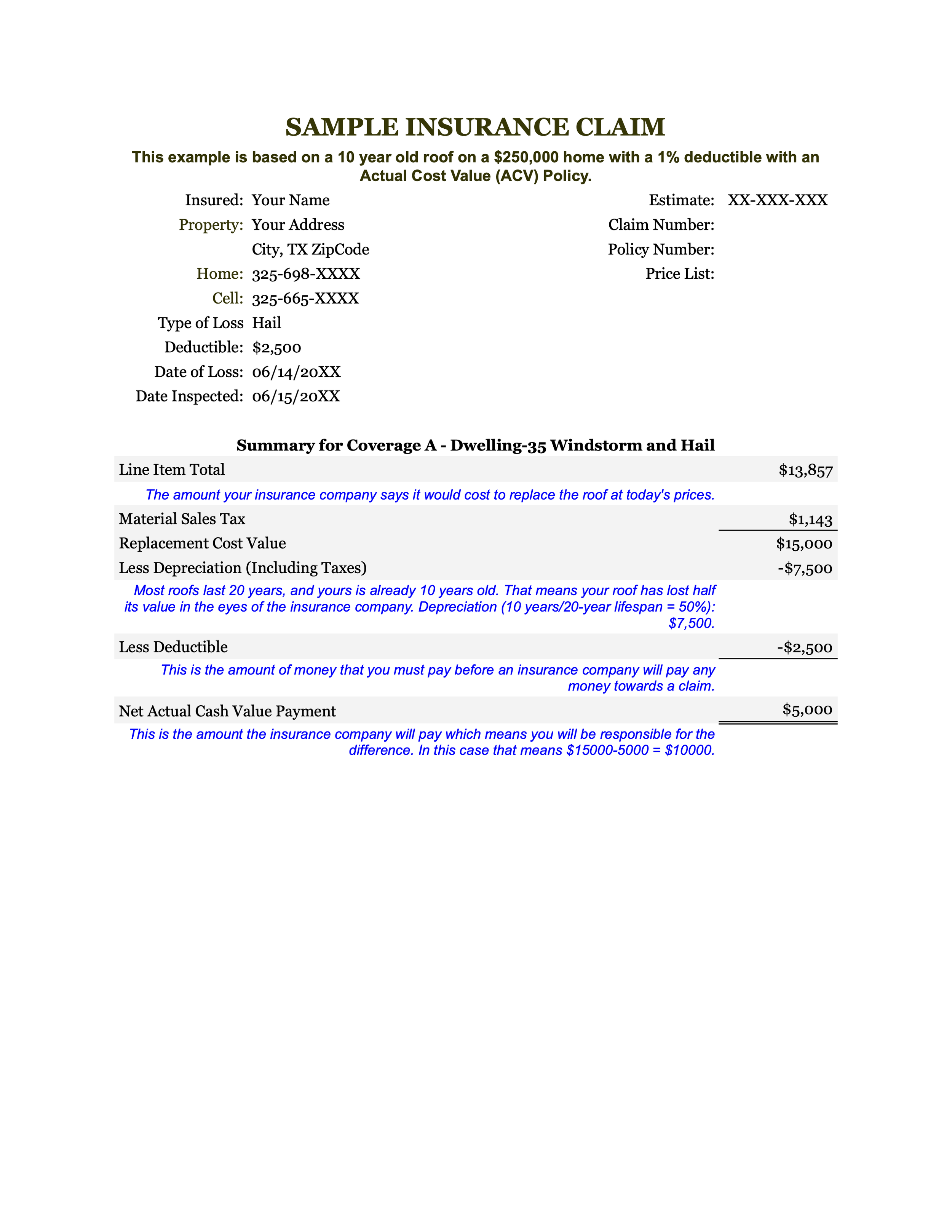 Depreciation: the amount your insurance company subtracts because your roof has aged. Your will owe this amount.